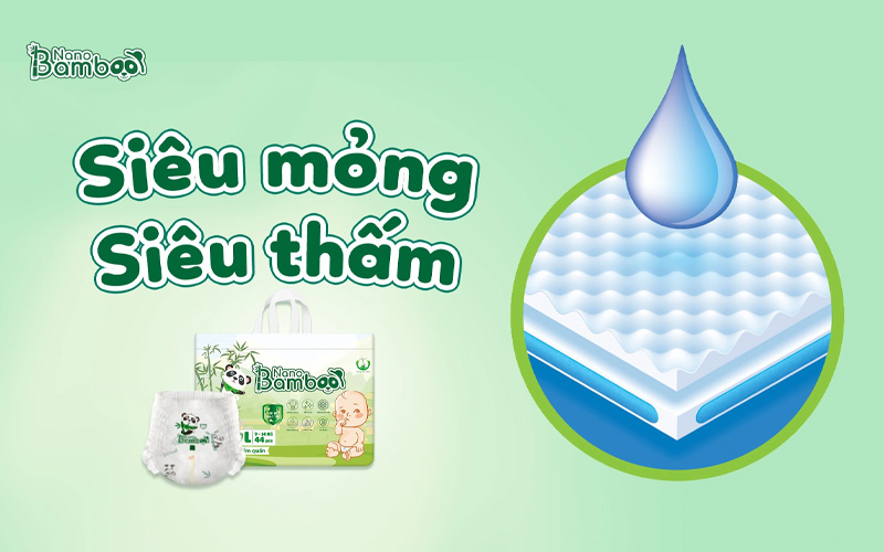 Nhờ công nghệ sản xuất tiên tiến, tã quần Nano Bamboo có khả năng thấm hút ẩm vượt trội, giúp bé luôn cảm thấy khô thoáng và thoải mái. Điều này không chỉ giúp ngăn ngừa tình trạng hăm tã, mà còn tạo cảm giác dễ chịu cho bé khi vận động.